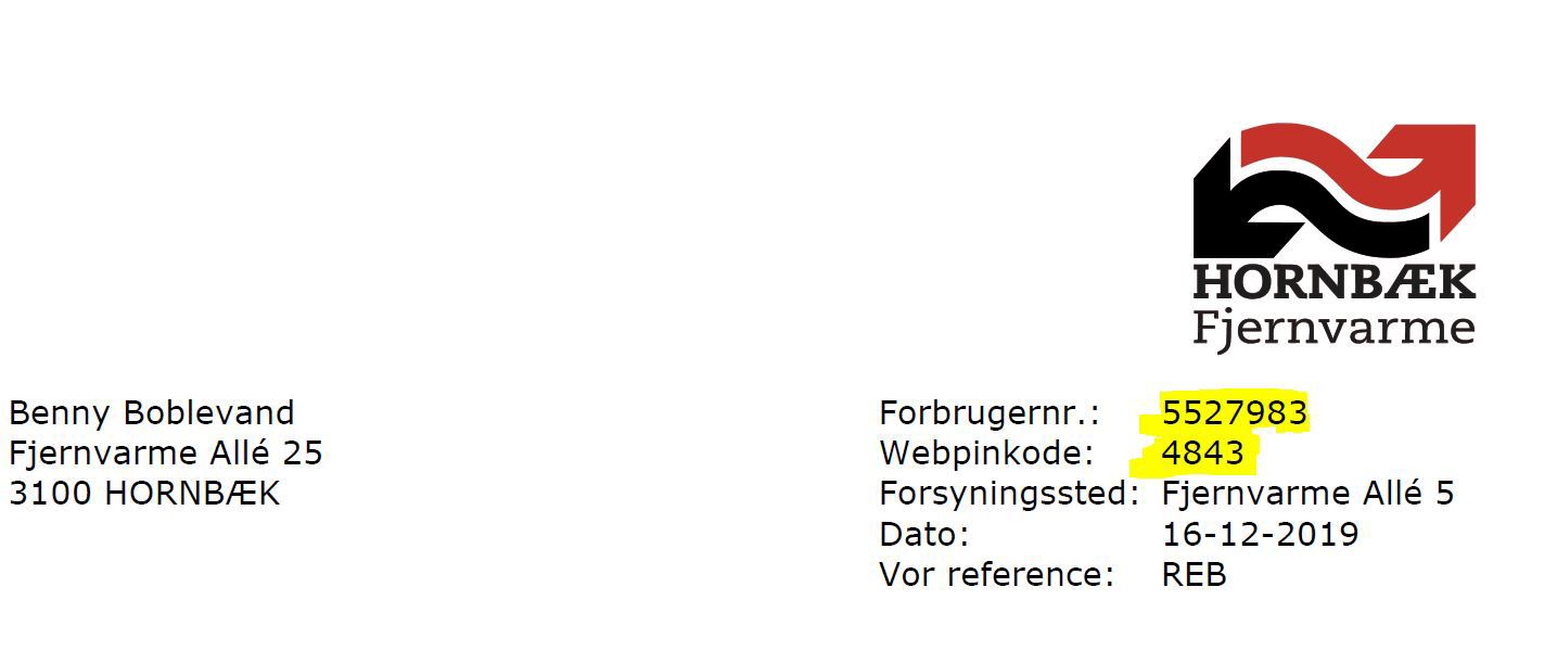 På de fleste breve fra Hornbæk Fjernvarme kan du se dit forbrugernummer og den kode du skal bruge til at logge ind på e|forsyning. De er markeret med gult på eksemplet herover.